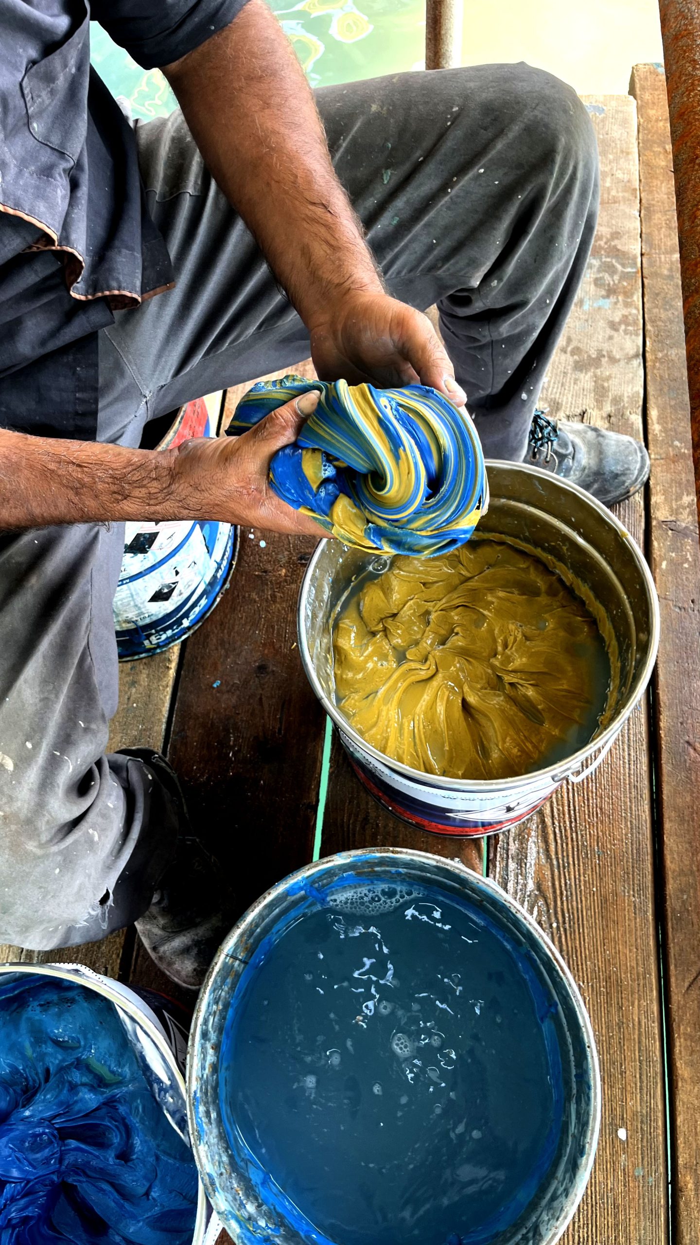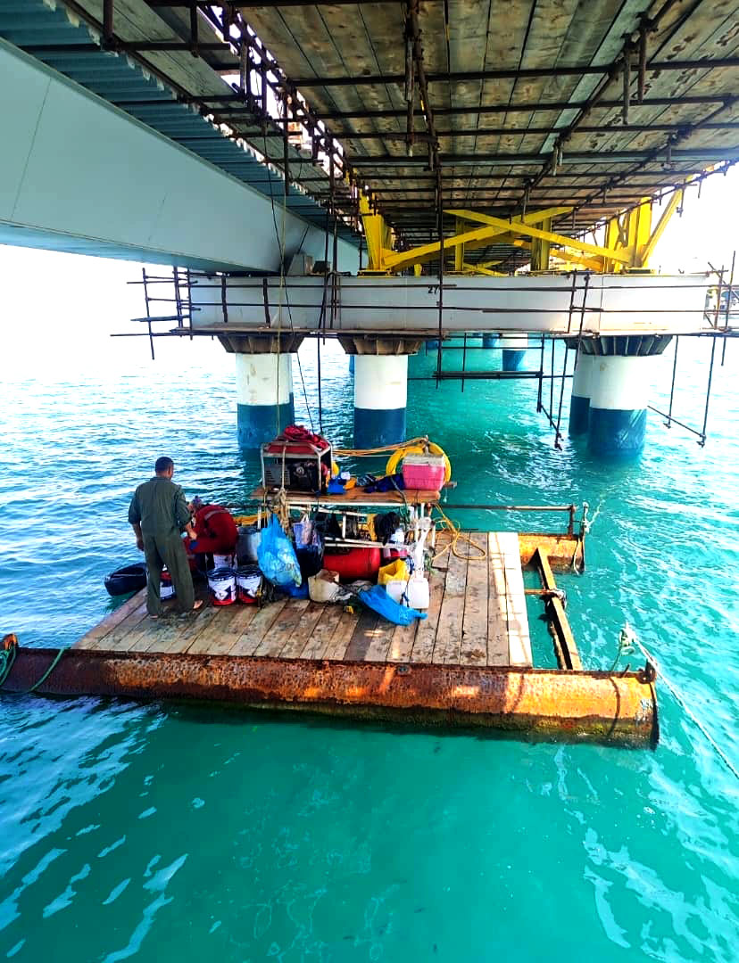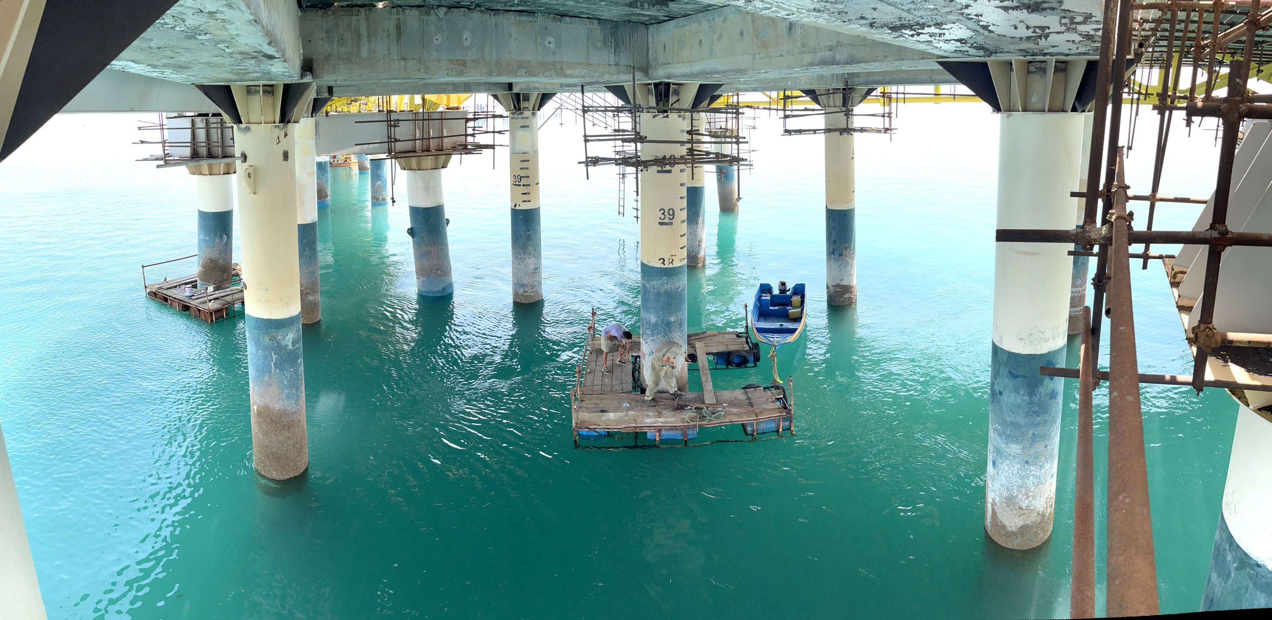 ناحیه اتمسفری به مساحت ۲۰۰۰ متر مربع با استفاده از رنگ گلس فلیک پوشش داده شده است. ناحیه جزر و مدی با مساحت ۱۵۰۰ متر مربع با استفاده از رنگ دو جزيی اپوکسی پلی آمین Zetagi با ضخامت ۳۰۰۰ میکرون پوشش داده شده است. این رنگ نسبت به آب شور مقاوم است و به صورت خمیری توسط نیروهای غواصی در آب اعمال و عمل آوری می گردد. به دلیل وجود جریان های جزر و مدی شدید این پروژه با چالش های اجرایی به خصوص در ناحیه جزر و مدی مواجه بود که خوشبختانه با موفقیت اجرا شد.
